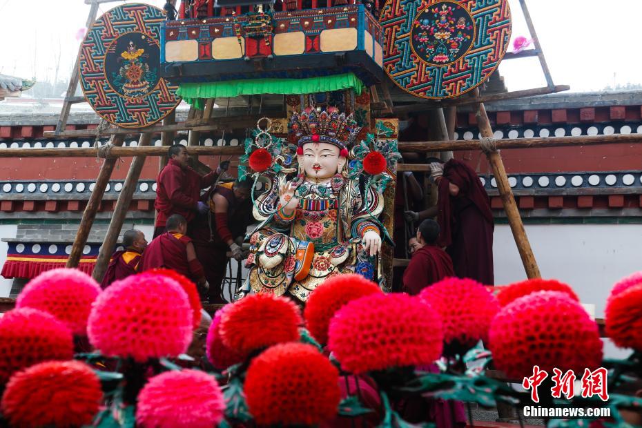 圖為僧人將酥油花主佛固定在花架上。中新社記者 馬銘言 攝
