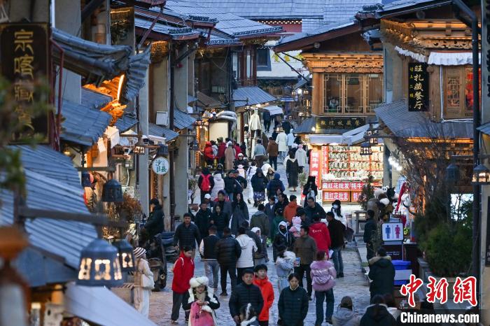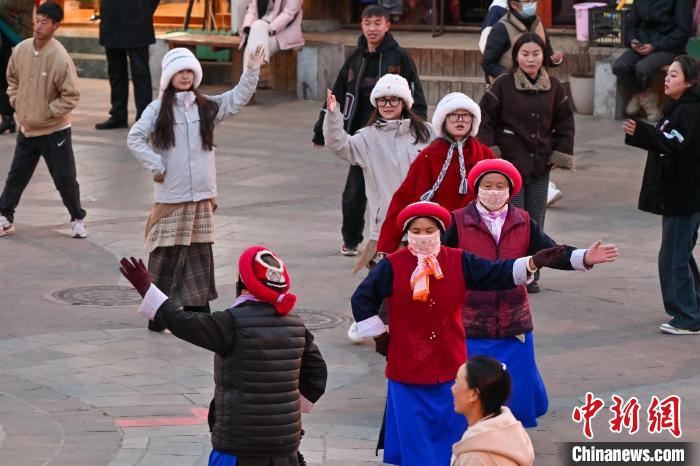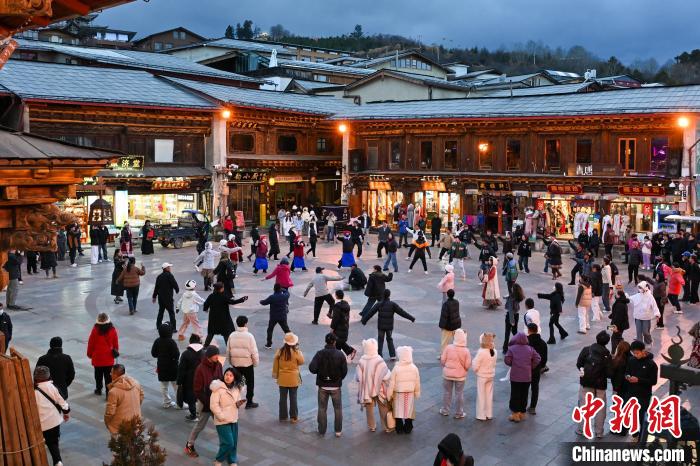 3月1日,游客在獨克宗古城與當(dāng)?shù)鼐用褚煌鴱V場舞。中新社記者 李嘉嫻 攝