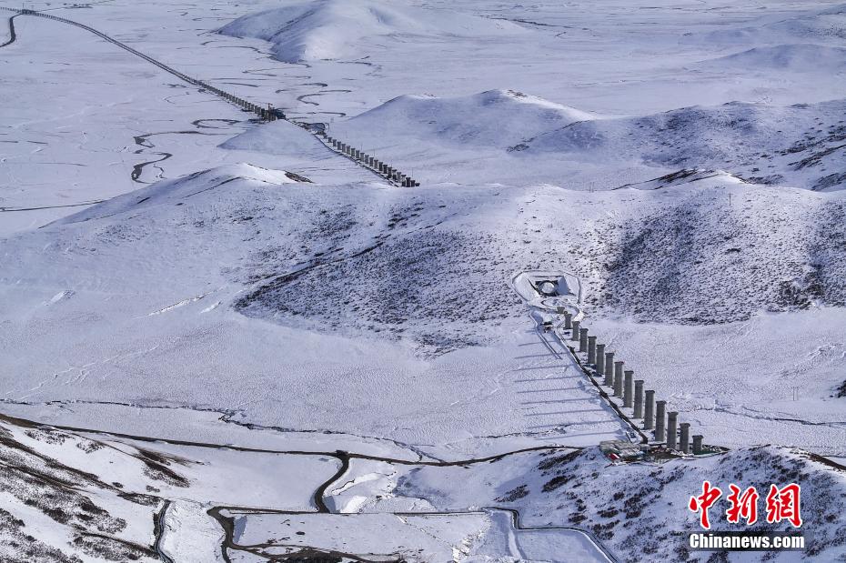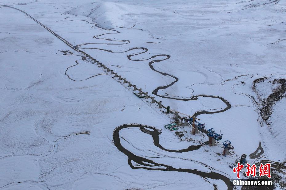3月17日,四川若爾蓋,航拍雪中正在建設(shè)的西寧至成都鐵路四川若爾蓋段。(無人機照片)中新社記者 劉忠俊 攝