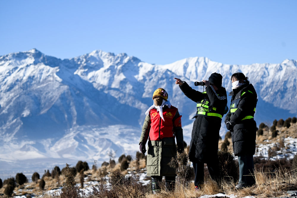 青海門(mén)源縣境內(nèi)的祁連山國(guó)家公園老虎溝管護(hù)站的生態(tài)管護(hù)員在巡護(hù)祁連山(2025年1月28日攝)。新華社記者 張龍 攝