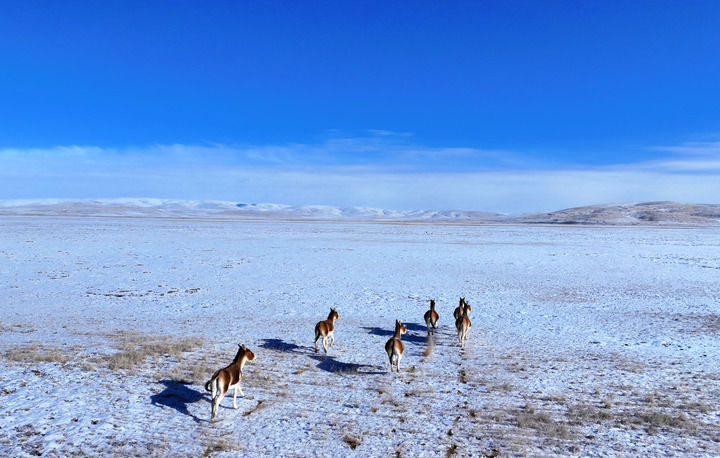 在青海省果洛藏族自治州瑪多縣黃河鄉(xiāng)境內(nèi),藏野驢在雪后活動(dòng)(2025年2月22日攝,無(wú)人機(jī)照片)。新華社記者 張宏祥 攝