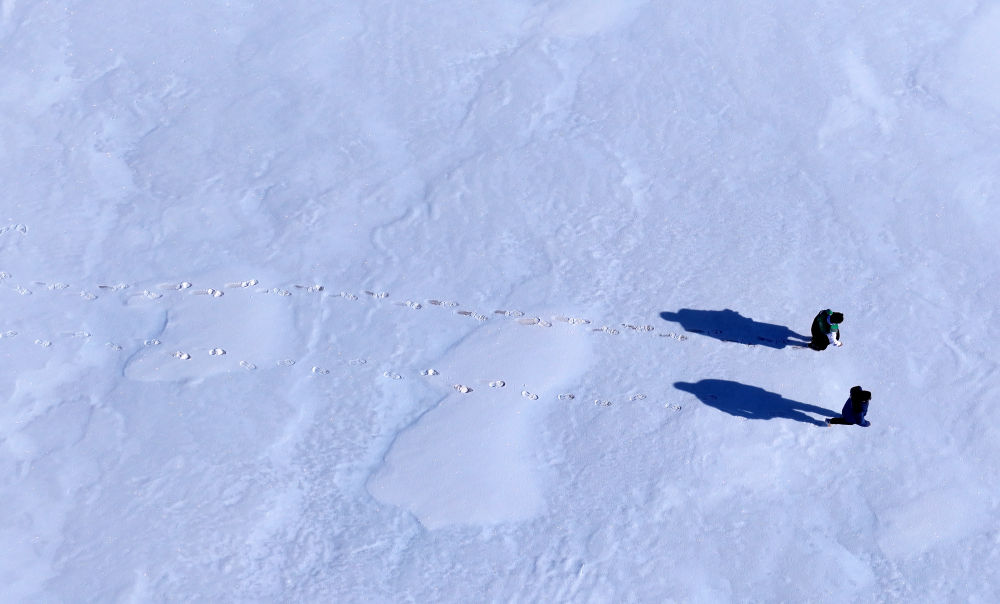 在青海省果洛藏族自治州瑪多縣黃河鄉(xiāng)境內(nèi),兩名生態(tài)管護(hù)員在開(kāi)展生態(tài)巡護(hù)(2025年2月22日攝,無(wú)人機(jī)照片)。新華社記者 張宏祥 攝