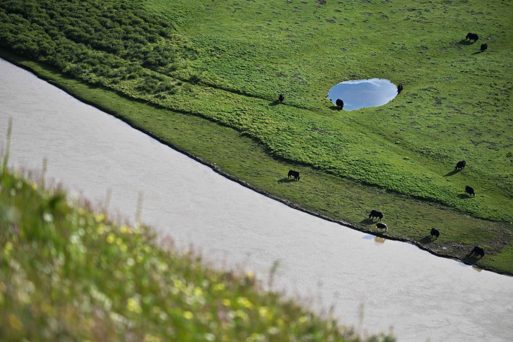 一群牦牛在青海省果洛藏族自治州達(dá)日縣境內(nèi)的黃河岸邊覓食(2024年7月31日攝)。新華社記者 李占軼 攝