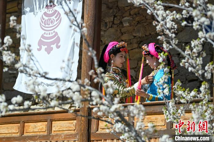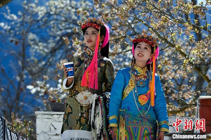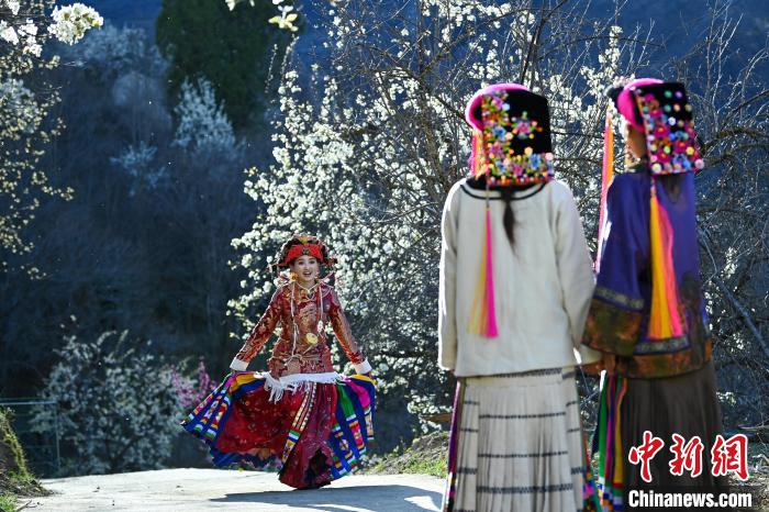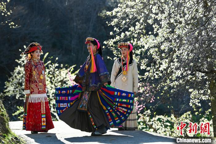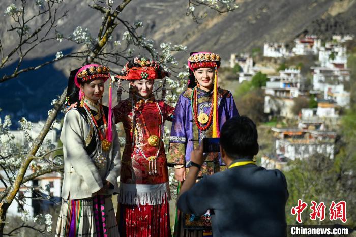 3月25日,四川丹巴,身著漂亮民族服飾的丹巴女孩們在梨花樹下合影拍照。中新社記者 劉忠俊 攝