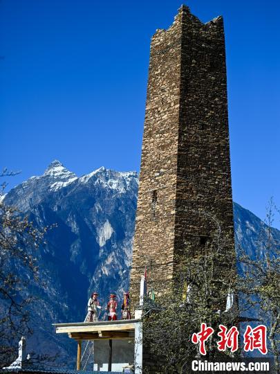 3月25日,四川丹巴,古碉下玩耍的丹巴女孩們。中新社記者 劉忠俊 攝