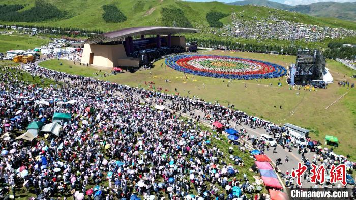 2024年8月4日,第22屆九色甘南香巴拉旅游藝術(shù)節(jié)在甘肅省甘南藏族自治州當周草原開幕。圖為開幕式現(xiàn)場鍋莊舞表演。(資料圖)九美旦增 攝