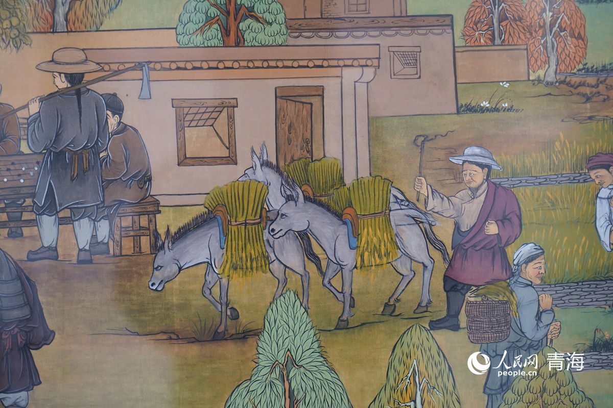 “隆務(wù)九曲圖”局部,展現(xiàn)的是當(dāng)?shù)厝罕娚顒谧鞯膱鼍?。人民網(wǎng)記者 楊啟紅 攝