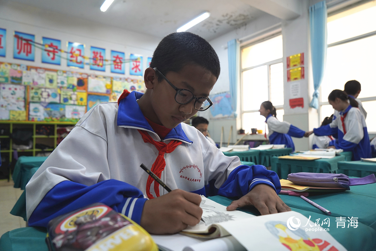 同仁市逸夫民族中學(xué)學(xué)生參加“埋下一顆種子在同仁”主題活動(dòng)時(shí)創(chuàng)作的繪畫作品。人民網(wǎng)記者 楊啟紅 攝