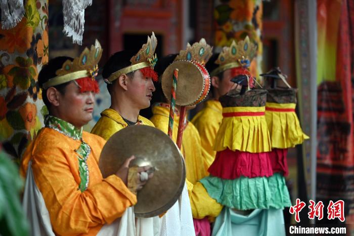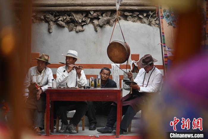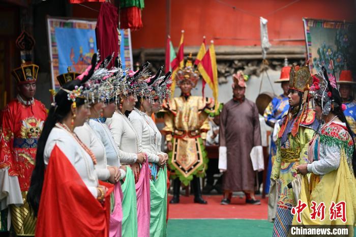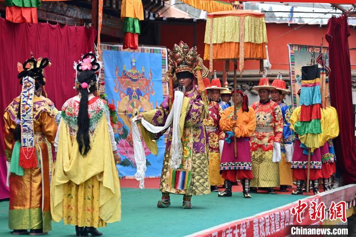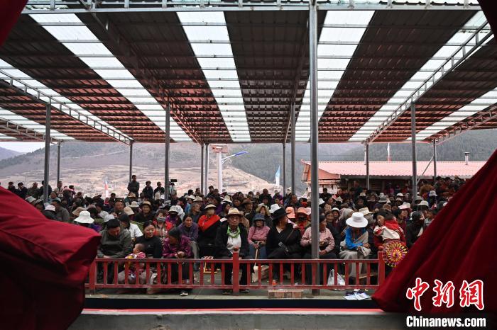 5月7日,在甘肅甘南藏族自治州碌曲縣雙岔鎮(zhèn)二地村,當?shù)卮迕裱堇[傳統(tǒng)八大藏戲之一的 《諾桑王子》 。中新社記者 九美旦增 攝