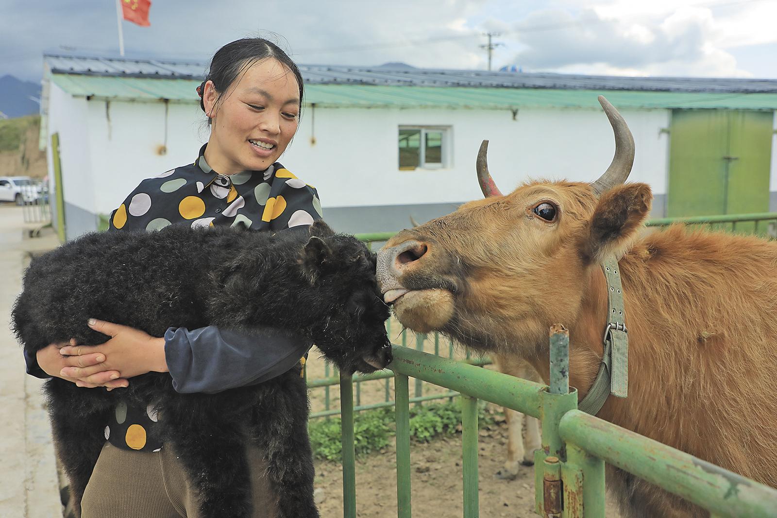 合作社女工抱著剛出生的娟姍犏牛寶寶。