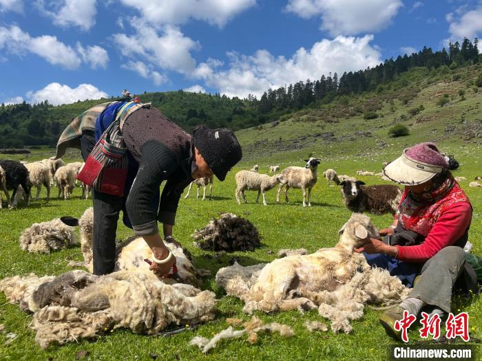 扎拉初姆(左)與七林央宗(右)在星沾牧場剪羊毛。中新網(wǎng)記者 王林 攝