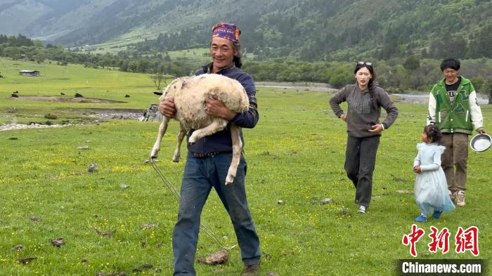 丹增培楚(左一)抱著準(zhǔn)備宰殺的綿羊向牧屋走去。駱忠華 攝
