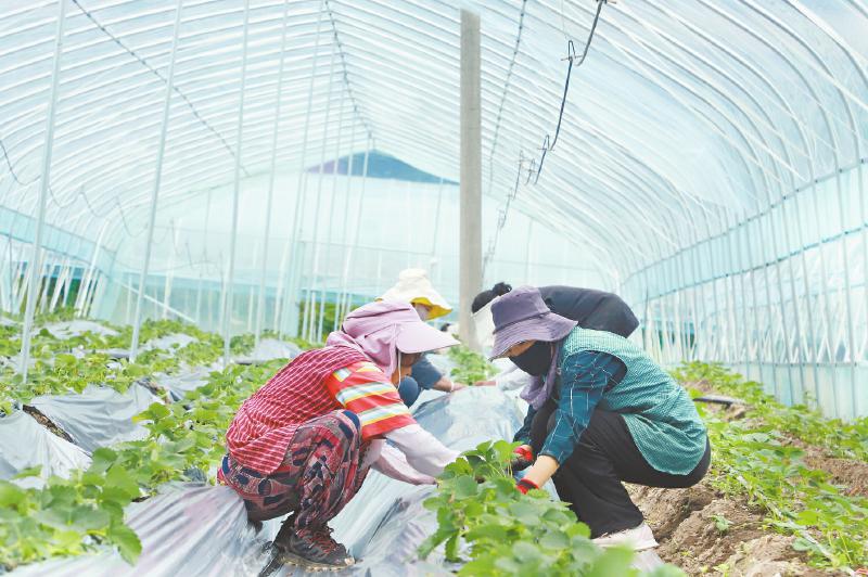 松崗鎮(zhèn)村民在草莓基地鋪地膜。劉文佳 攝
