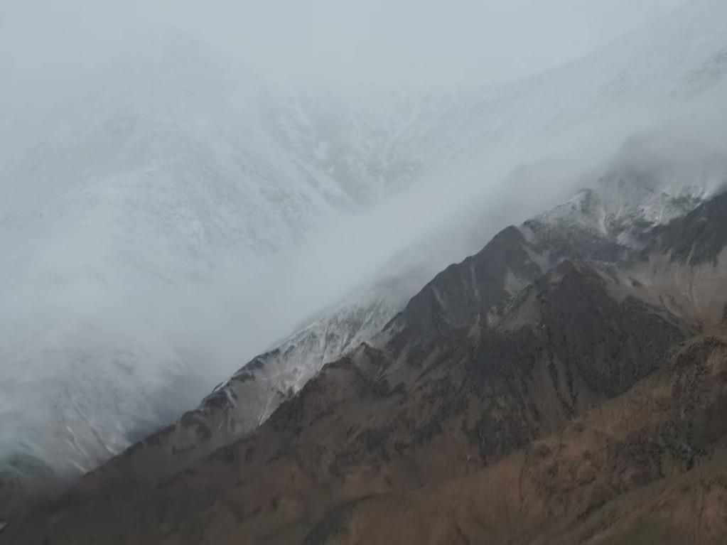 半個(gè)小時(shí)之后,風(fēng)勢(shì)在幾滴雨點(diǎn)的打擊下,漸漸緩和下來(lái)。當(dāng)沙幕隱去,露出被磨洗過的藍(lán)天時(shí),我們都長(zhǎng)舒了一口氣。擋風(fēng)玻璃上的兩側(cè),裹了厚厚一層泥巴。遠(yuǎn)處的山峰頂上,白雪在太陽(yáng)的余暉下,染成了金黃。