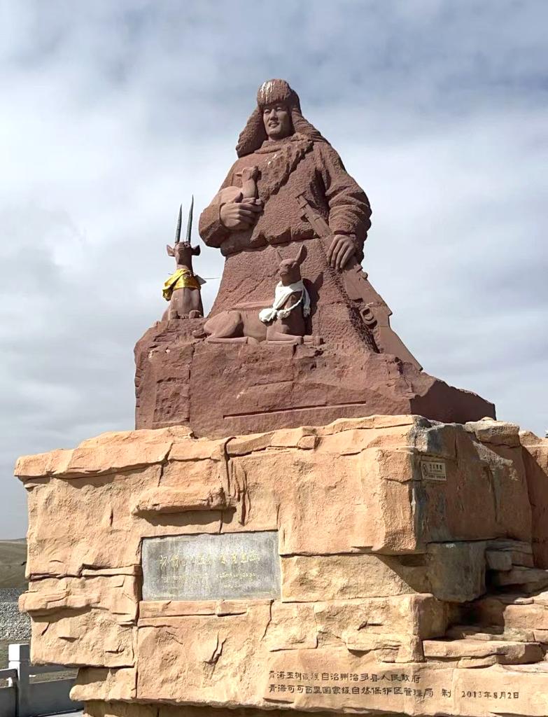 昆侖山口,索南達杰紀念碑靜靜矗立。紀念碑旁砂紅色的雕像,高大而肅穆。我們下車,向這位因守護可可西里藏羚羊而犧牲的英雄鞠躬致敬。