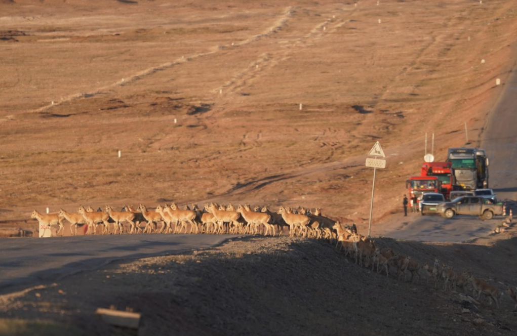 繁忙的公路突然“靜音”,遠(yuǎn)處車(chē)流、人群安靜等待,幾只藏羚羊緩慢踏上公路,頭羊反復(fù)“試探”確認(rèn)安全后,羊群再迅速穿過(guò)公路。