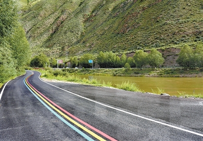 在高水平生態(tài)保護的基礎(chǔ)上,當(dāng)?shù)亓⒆闾厣Y源,推進美麗鄉(xiāng)村建設(shè)。借助對口幫扶資金,玉樹市巴塘鄉(xiāng)實施了勒巴溝旅游公路提升工程,歷時3個月,新建4.5公里瀝青混凝土路,另有17.625公里為原有水泥砼路面瀝青罩面并增設(shè)彩色旅游標(biāo)線,總長為22.125公里,目前已經(jīng)進入準(zhǔn)備驗收階段。勒巴溝旅游公路半段緊鄰巴塘河,半段伴隨金沙江,青黃“接力”景象吸引了眾多訪客。