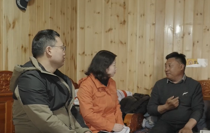 記者在可可西里采訪(fǎng)秋培扎西(右一)。 新華社記者 鄧寒思 攝
