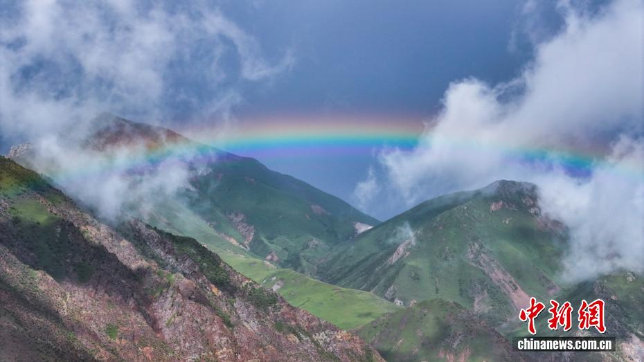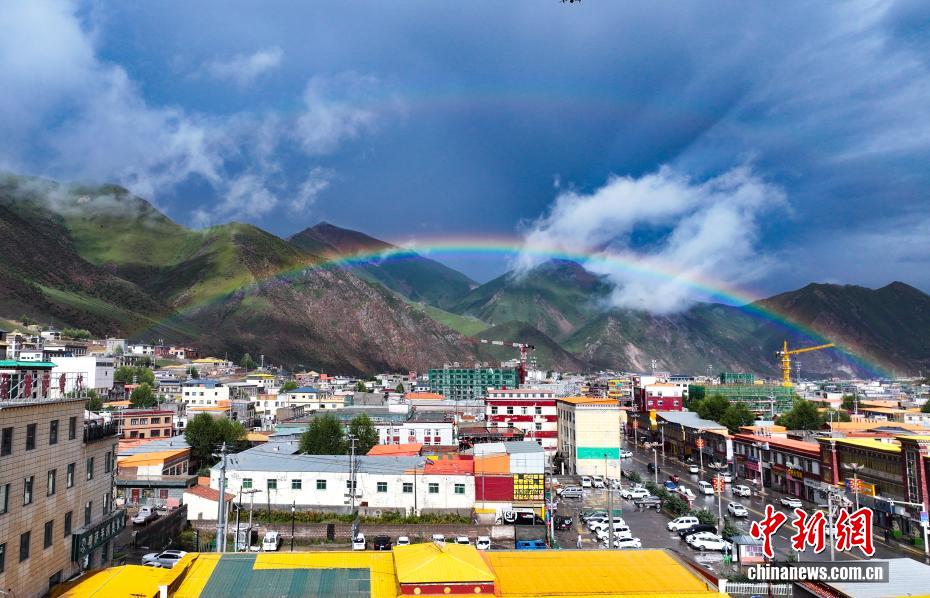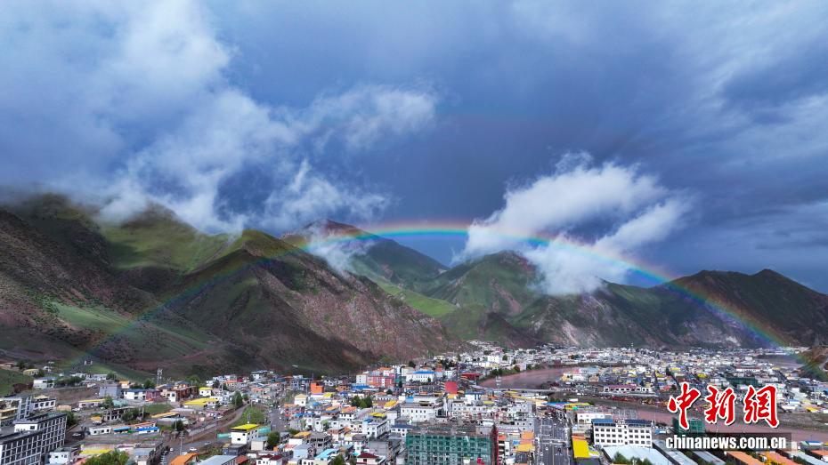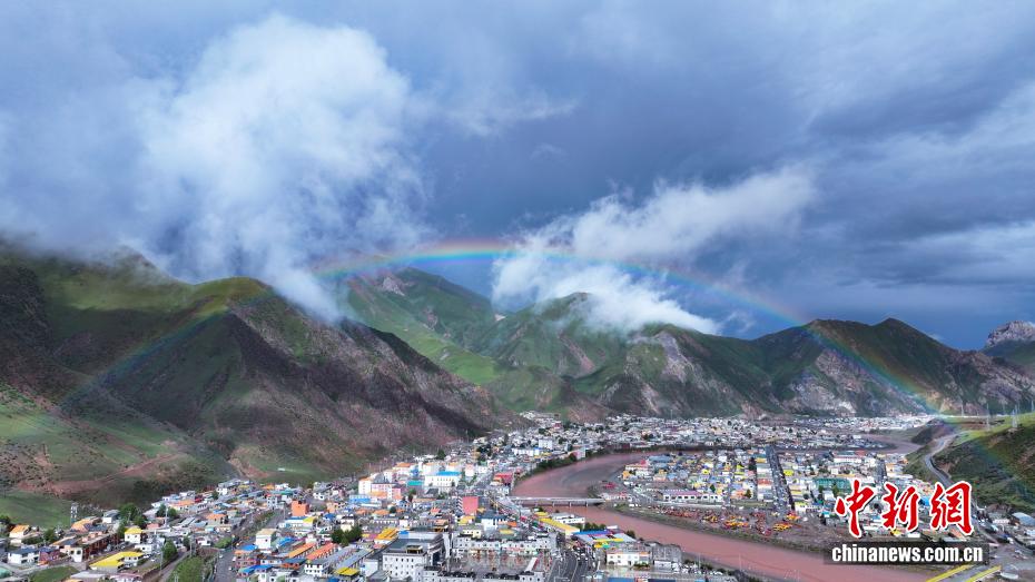 8月21日,參加2025瀾湄國際影像周的中外嘉賓來到瀾滄江源第一縣——青海省玉樹藏族自治州雜多縣進(jìn)行采風(fēng)拍攝。傍晚時(shí)分,一場(chǎng)降雨后,縣城上空出現(xiàn)彩虹美景。(無人機(jī)照片)中新社記者 馬銘言 攝