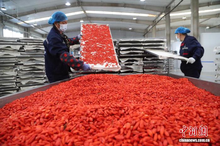 9月4日,青海省海西蒙古族藏族自治州格爾木市種植的柴達(dá)木枸杞迎來豐收季。圖為工人在枸杞加工車間作業(yè)。 張忠蘋 攝