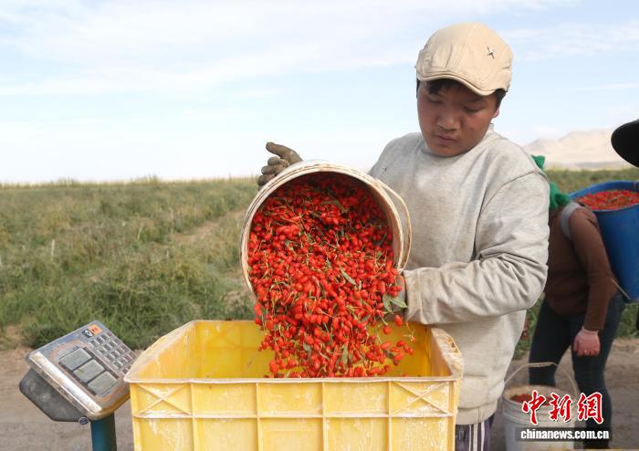 9月4日,青海省海西蒙古族藏族自治州格爾木市種植的柴達(dá)木枸杞迎來豐收季。圖為工人對采摘的枸杞進(jìn)行稱重。 張忠蘋 攝