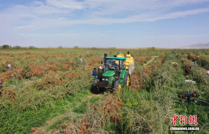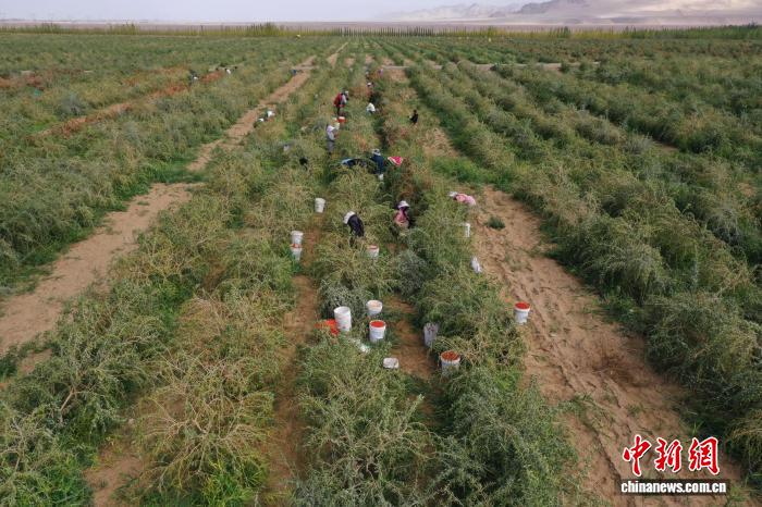 9月4日,青海省海西蒙古族藏族自治州格爾木市種植的柴達(dá)木枸杞迎來豐收季。圖為工人采摘新鮮的枸杞。(無人機(jī)照片) 張忠蘋 攝