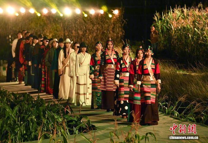 在四川省甘孜藏族自治州鄉(xiāng)城縣青德鎮(zhèn)白龔村,玉米田間的一塊空地被改造成露天T臺(tái)。不遠(yuǎn)處,一座座白藏房靜靜矗立于夜色,凝視著這片歡騰的土地。20日晚,一場(chǎng)別開生面的田園“瘋”裝秀,就在這寧?kù)o而熱烈的氛圍中上演。