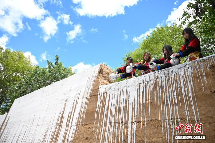 9月21日,四川省甘孜州鄉(xiāng)城縣青德鎮(zhèn),一些游客穿上藏族女性特有的傳統(tǒng)禮服“瘋裝”,在白藏房前體驗“白色灌禮”習俗,感受川西小城鄉(xiāng)城縣獨有的文化魅力。