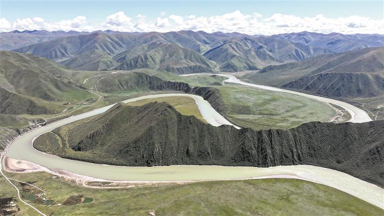 9月16日,從青海省果洛藏族自治州久治縣出發(fā),沿花久高速公路行駛約一小時后,抵達門堂鄉(xiāng)果囊村。這里有黃河首曲女兒灣,之所以稱為“女兒灣”,是因為黃河在這里出青海省境,流到甘肅省甘南藏族自治州瑪曲,又回繞至黃南藏族自治州河南蒙古族自治縣,形成一道壯美的自然回環(huán),貌似出嫁的女兒回望家鄉(xiāng)。