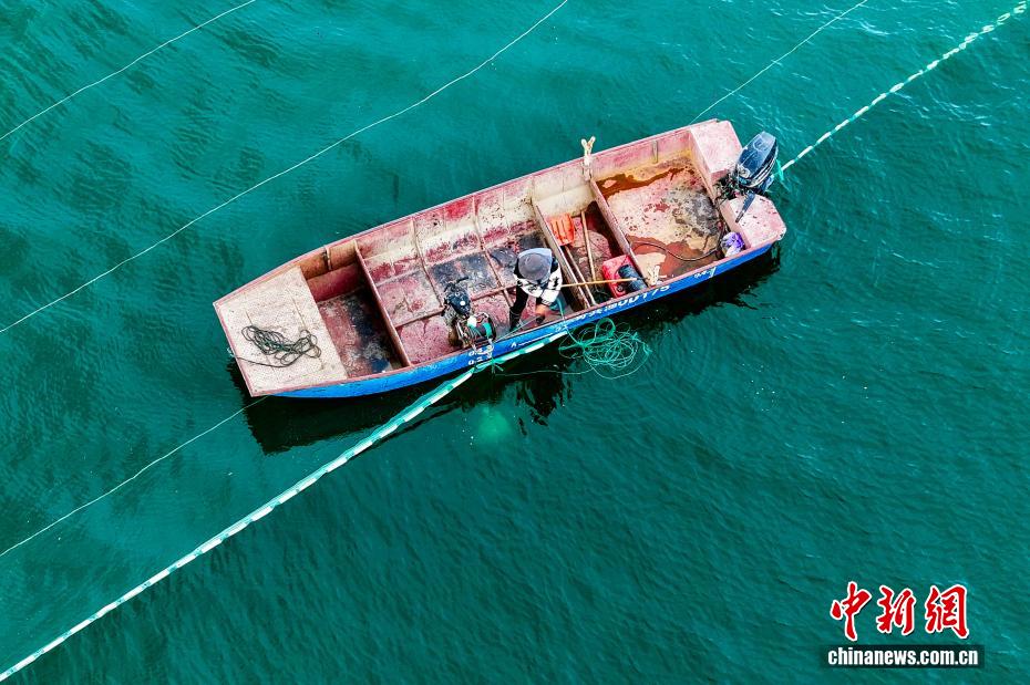 圖為漁民查看布置完成的漁網(wǎng)。(無人機照片)中新社記者 薛蒂 攝