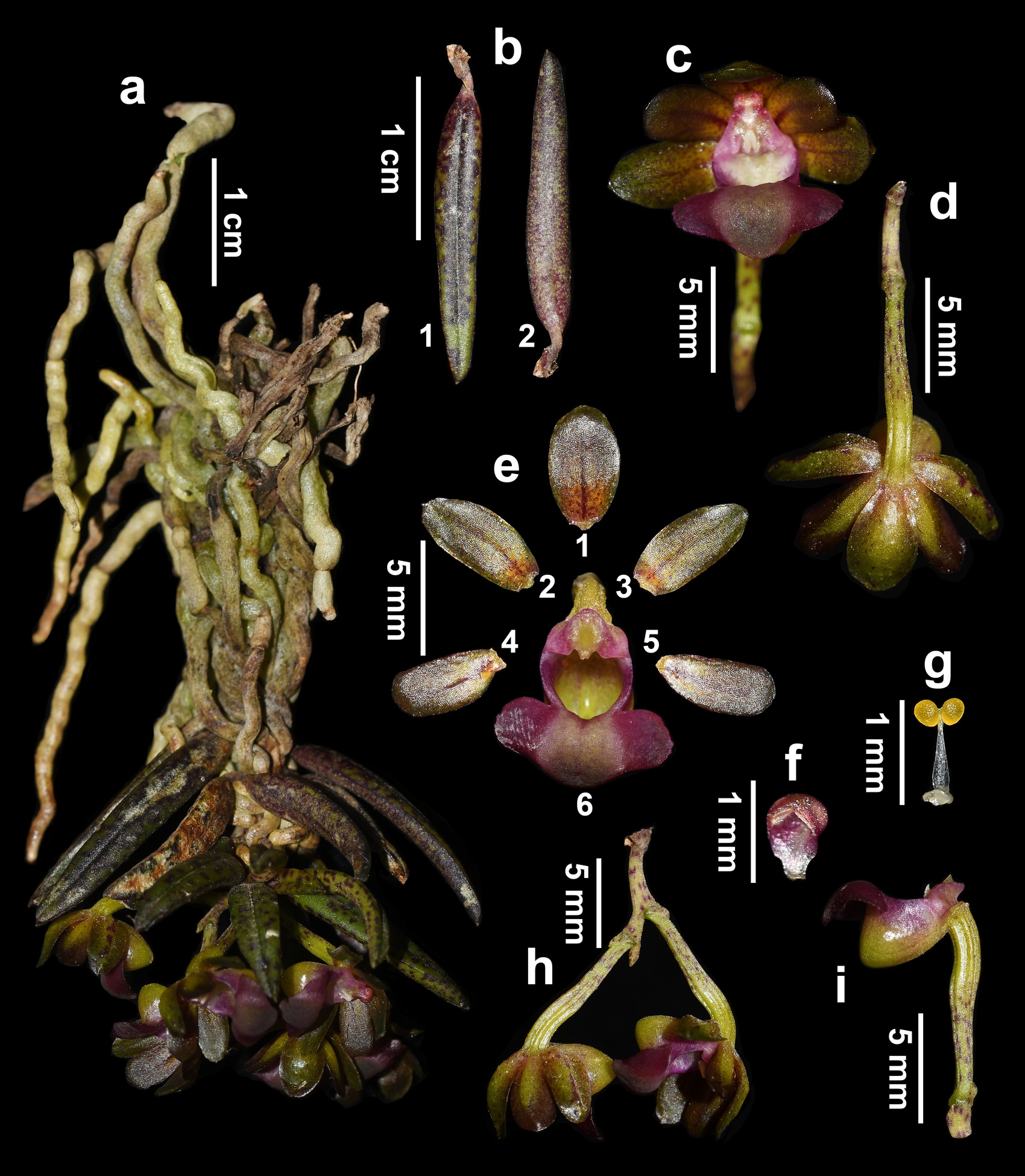 盆距蘭屬隸屬于蘭科樹蘭亞科指甲蘭亞族,全球約73種,是一類附生在熱帶和亞熱帶山地森林中樹木或巖石上的草本植物。該屬植物的唇瓣色彩斑斕、結(jié)構(gòu)精巧,具有較高的觀賞價(jià)值。根據(jù)分析,九寨溝盆距蘭隸屬于盆距蘭屬列葉組,該種的發(fā)現(xiàn)將列葉組的物種數(shù)量增加到16種,不僅豐富了物種圖譜,更對區(qū)域植物生態(tài)適應(yīng)機(jī)制研究具有重要價(jià)值。(圖片由中國科學(xué)院成都生物研究所提供)