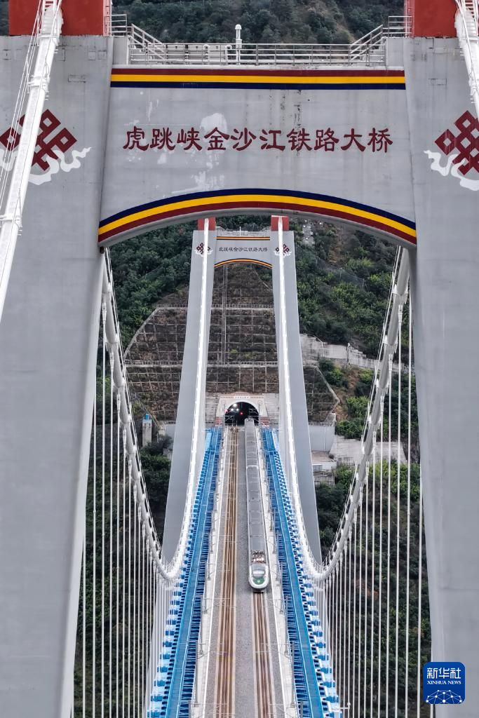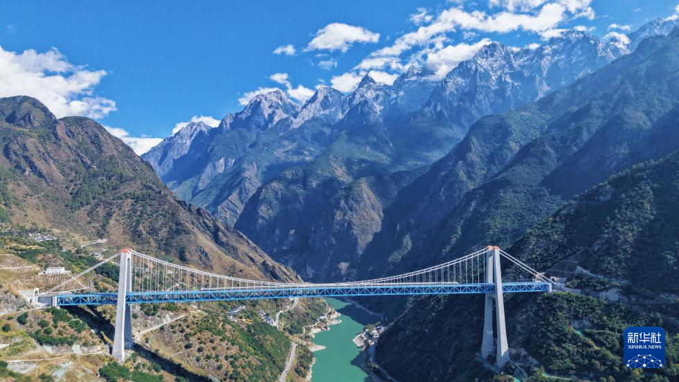 這是11月21日拍攝的虎跳峽金沙江鐵路大橋。大橋全長882.5米,起于玉龍雪山隧道出口,止于哈巴雪山隧道進口,是麗香鐵路的重點控制性工程(無人機照片)。新華社 楊紫軒 攝