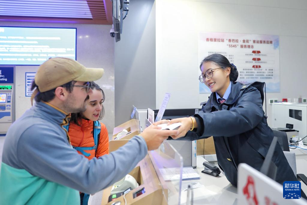 11月18日,外籍旅客在云南香格里拉站“香巴拉·金花”服務臺購票。車站為旅客提供“一站式”出行服務。新華社 楊紫軒 攝