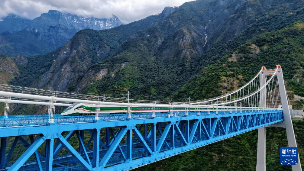 11月21日,動車組列車通過虎跳峽金沙江鐵路大橋(無人機照片)。新華社 楊紫軒 攝