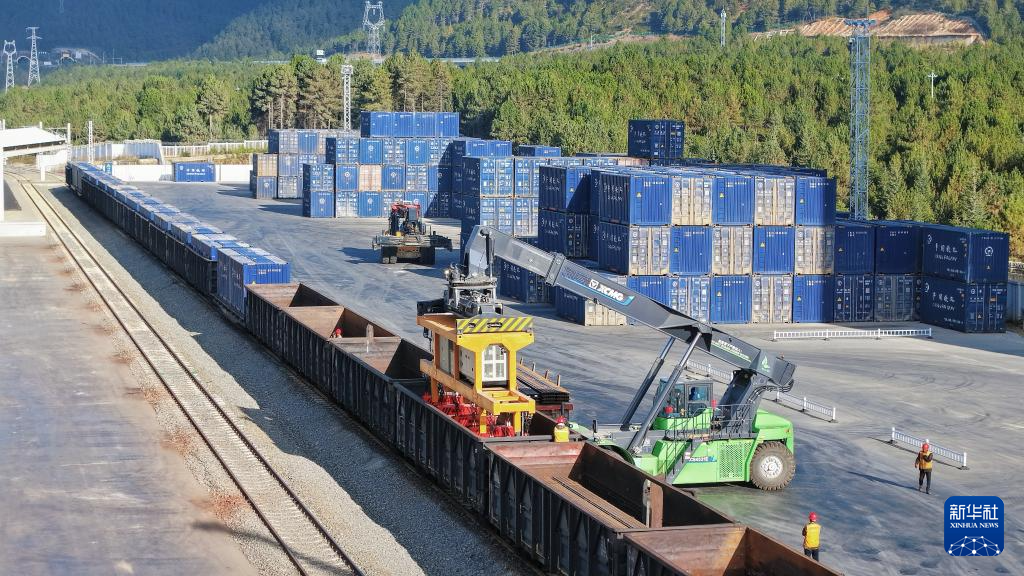 11月21日,工人在云南迪慶藏族自治州小中甸貨場進行裝卸作業(yè)(無人機照片)。新華社 楊紫軒 攝