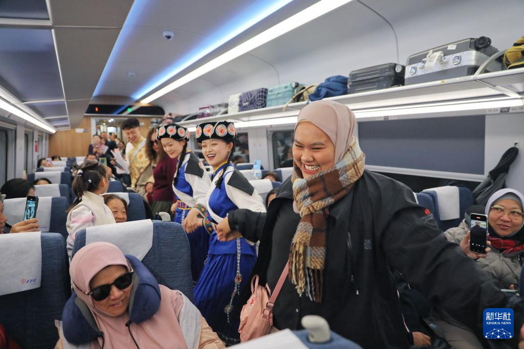 11月22日,在麗香鐵路動車組列車上,東南亞游客與身著民族服飾的乘務員一同跳舞。新華社 楊紫軒 攝