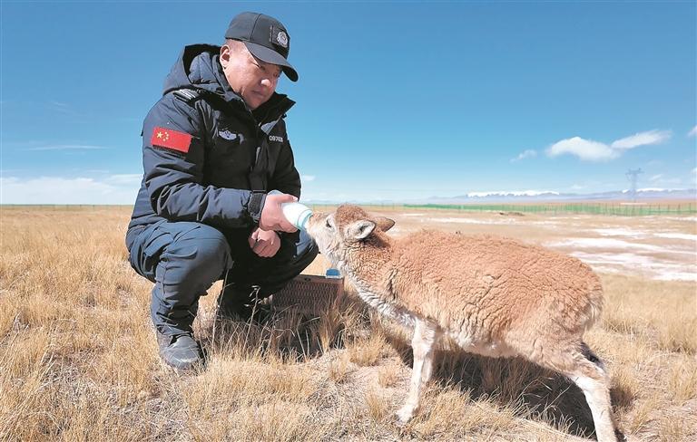 2023年,鬧布東周被調往卓乃湖保護站,“我們每天出去巡護,遇到受傷的小藏羚羊或者失去母親的藏羚羊孤兒,都會小心翼翼地救回保護站?!濒[布東周說,剛出生的小藏羚羊身體虛弱,不會用奶嘴喝奶,他們就嘴對嘴的方式喂牛奶。