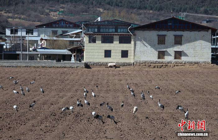 1月22日,一群黑頸鶴在納帕海棲息。中新社記者 黃興鴻 攝