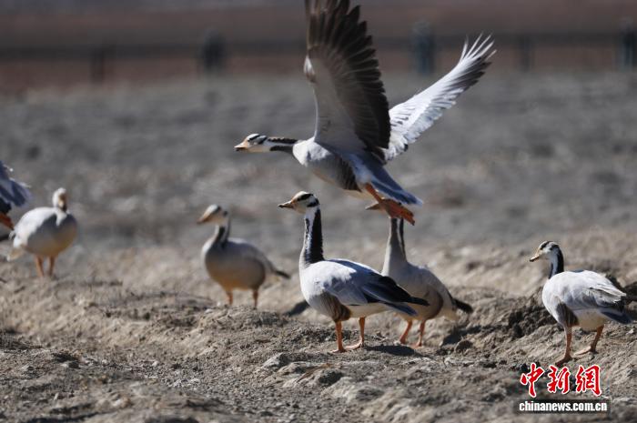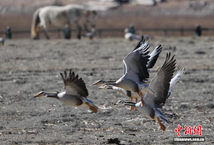 1月22日,一群斑頭雁在納帕海嬉戲。中新社記者 黃興鴻 攝