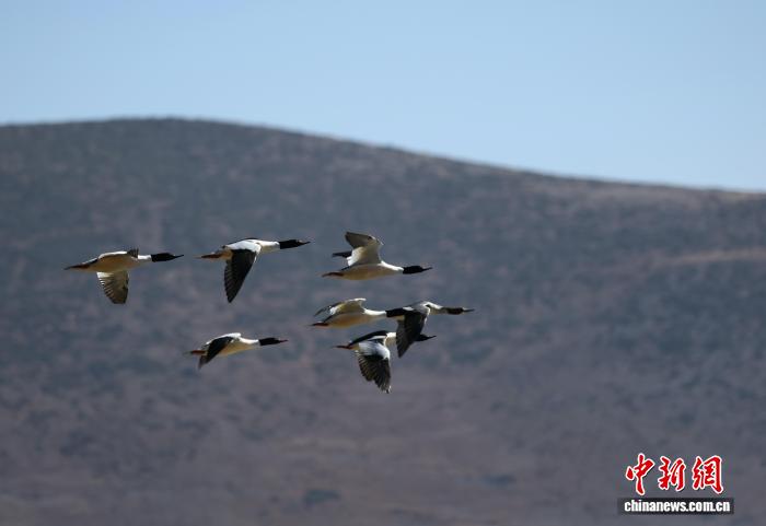 1月22日,一群秋沙鴨在空中飛翔。中新社記者 黃興鴻 攝