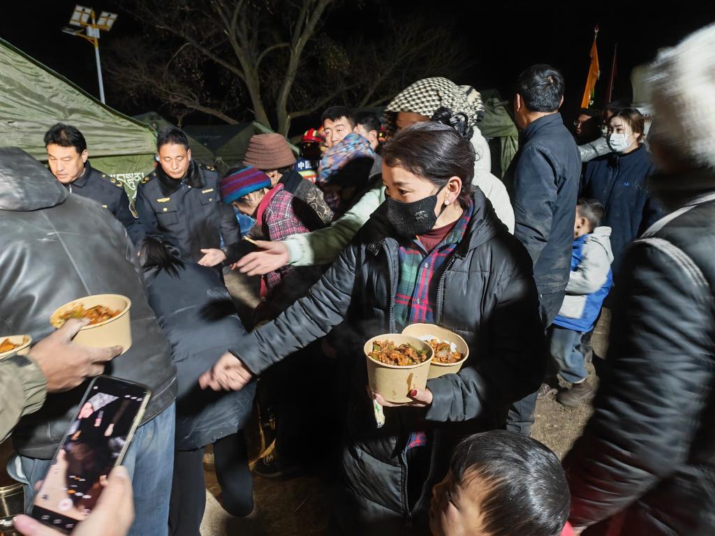 1月26日晚,在甘南州迭部縣電尕鎮(zhèn)哇曲村臨時(shí)安置點(diǎn),群眾正在領(lǐng)取愛(ài)心餐食。新華社記者 崔翰超 攝
