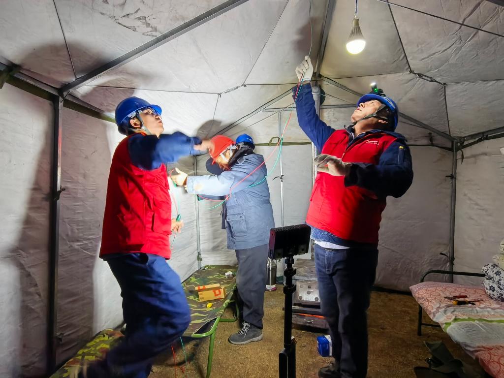 1月26日晚,國(guó)網(wǎng)甘南供電公司工作人員為臨時(shí)安置點(diǎn)應(yīng)急帳篷接電。國(guó)網(wǎng)甘南供電公司供圖