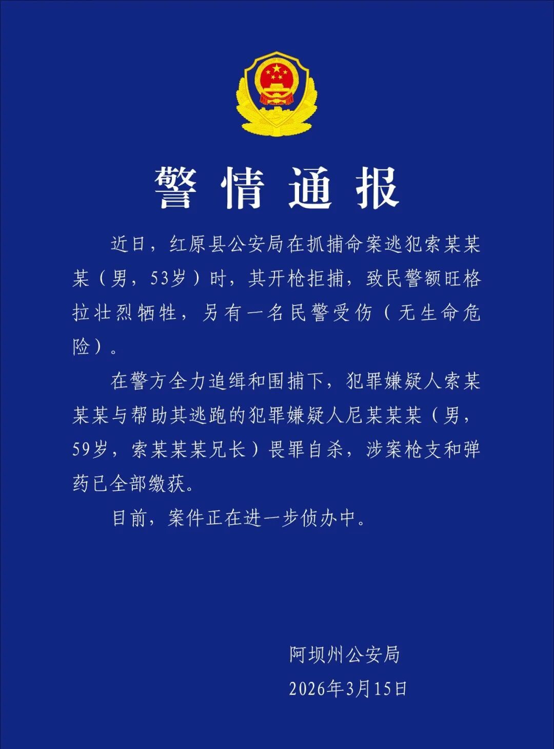 3月15日,阿壩州公安局發(fā)布警情通報:近日,紅原縣公安局在抓捕命案逃犯索某某某(男,53歲)時,其開槍拒捕,致民警額旺格拉壯烈犧牲,另有一名民警受傷(無生命危險)。