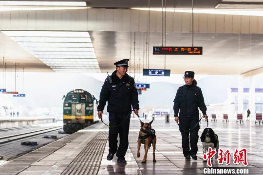 拉薩車站派出所民警惠旭東與見習民警易楠攜犬在站臺巡邏。 胡安鵬 攝