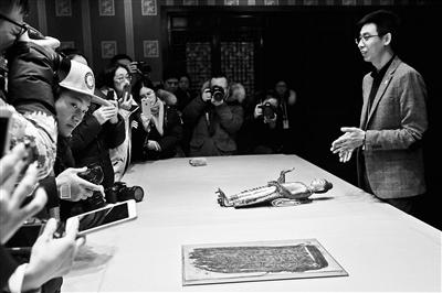 一件黑色打底、褐色花紋的織錦輕輕地用玻璃板夾著,經(jīng)考證它誕生在公元三世紀(jì),雖然“年事已高”,但仔細(xì)看上去仍可清晰辨別出上面有成對(duì)的孔雀、鳥(niǎo)等動(dòng)物出現(xiàn),甚至還能看到“王侯”兩個(gè)漢字。據(jù)首博策展人張杰介紹:“從字體看已經(jīng)接近隸書(shū),顯然這是中原生產(chǎn)的,后來(lái)傳入西藏。這從一個(gè)側(cè)面說(shuō)明,當(dāng)年雙方已經(jīng)有文化交往?!?/p>