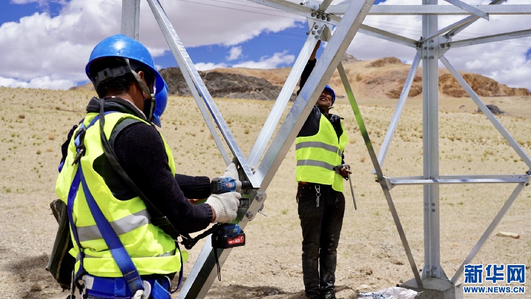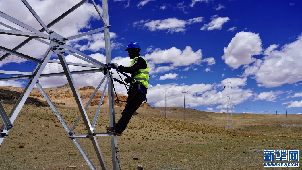 6月25日,西藏措勤縣磁石鄉(xiāng)35千伏輸變電工程現(xiàn)場(chǎng),電力建設(shè)者正在進(jìn)行輸電線(xiàn)路隱患排查。新華網(wǎng) 達(dá)珍 攝