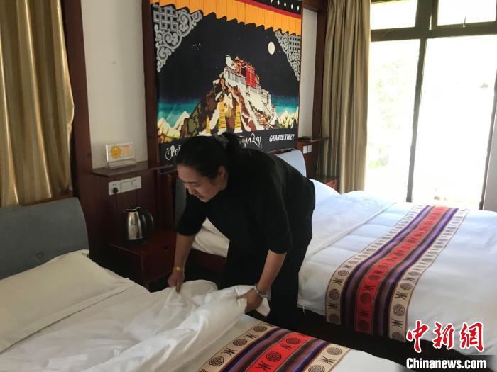 次仁德吉整理客房床鋪。冉文娟 攝