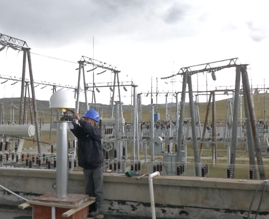 現(xiàn)場工作人員在當(dāng)雄110KV變電站進(jìn)行北斗衛(wèi)星接收天線安裝調(diào)試工作。任興旺 攝