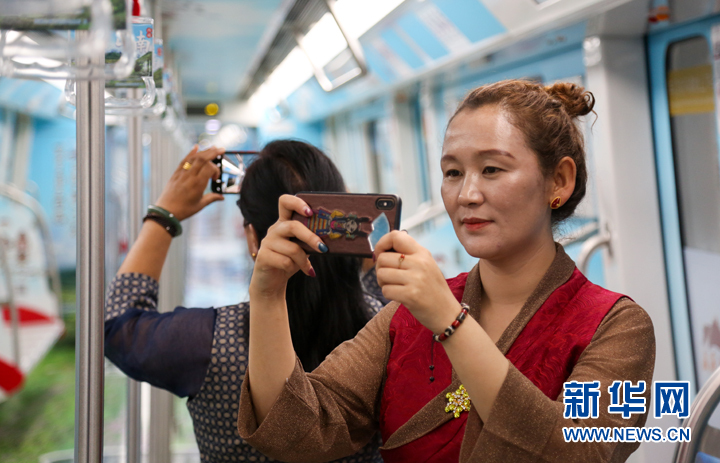 山南市的市民在地鐵車廂內(nèi)拍照。