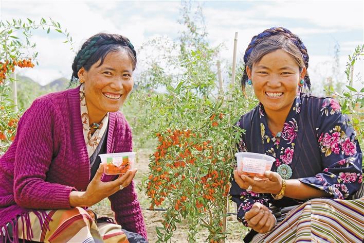 圖為當?shù)厝罕娬谡故驹谌湛t市白朗縣嘎東鎮(zhèn)枸杞產業(yè)園區(qū)配套水保綜合項目內收獲的枸杞。